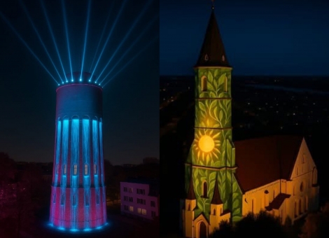 Organizatorių parengta Vandentiekio bokšto ir Šiaulių Šv. apaštalų Petro ir Pauliaus katedros apšvietimo vizualizacija.